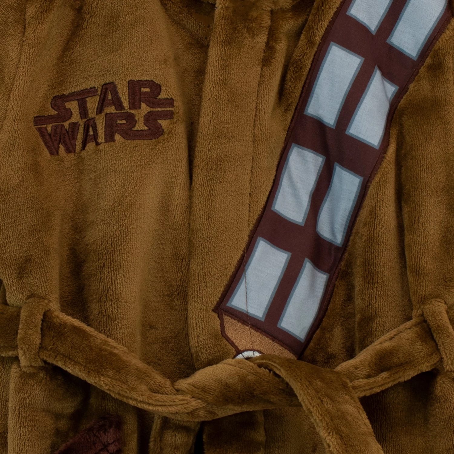 WURRRWUHHH! Embrace your inner Wookiee in this galactically awesome Chewbacca style bath robe! This brown Star Wars dressing gown is reminiscent of the warm-hearted Wookiee’s iconic look and features an applique of Chewie’s signature bandolier and side satchel as a large waist pocket. A tie-belt and hood completes this soft fluffy gown, perfect for little Star Wars fanatics to snuggle up in whatever planet they are on!
