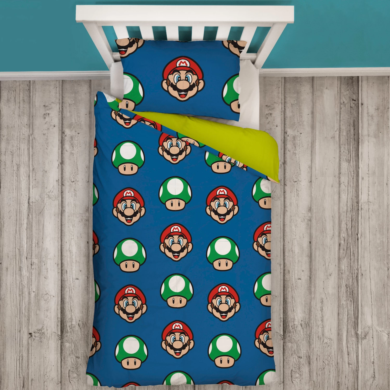 Get ready to embark on a dreamy adventure in the Mushroom Kingdom with this Super Mario Bros single duvet cover set! One side of the reversable duvet shows Mario with his famous catchphrase “It’s-a me, Mario!” on a bright green background. The other side features a cool pattern of Mario and power-up mushrooms over a blue base. Complete with a pillowcase with two different designs, one with the Super Mario logo and the other matching the duvet’s reverse side. Made from recycled polyester this bedding set is perfect for any young gamer who wants to snuggle up and dream of epic adventures.