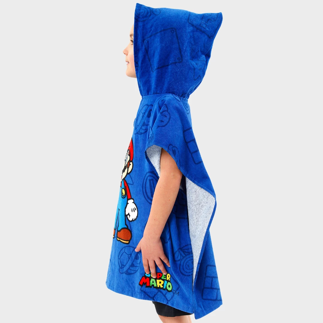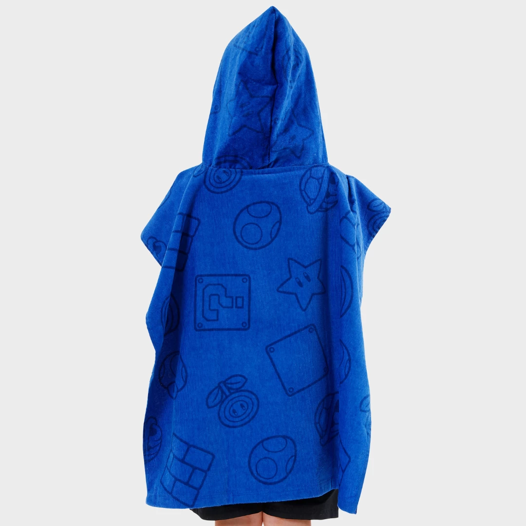 It’s a-me, Mario! Gear up your gamer for fun adventures at the pool or beach with Mario in this awesome gaming poncho. Features a large print of Mario on the front and the multicoloured ‘Super Mario’ logo. In a vibrant blue patterned with imagery from the iconic game. The hood keeps them cosy and warm while they dry off from their fun swimming adventure