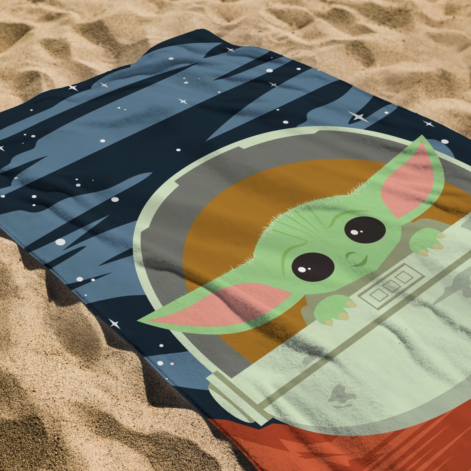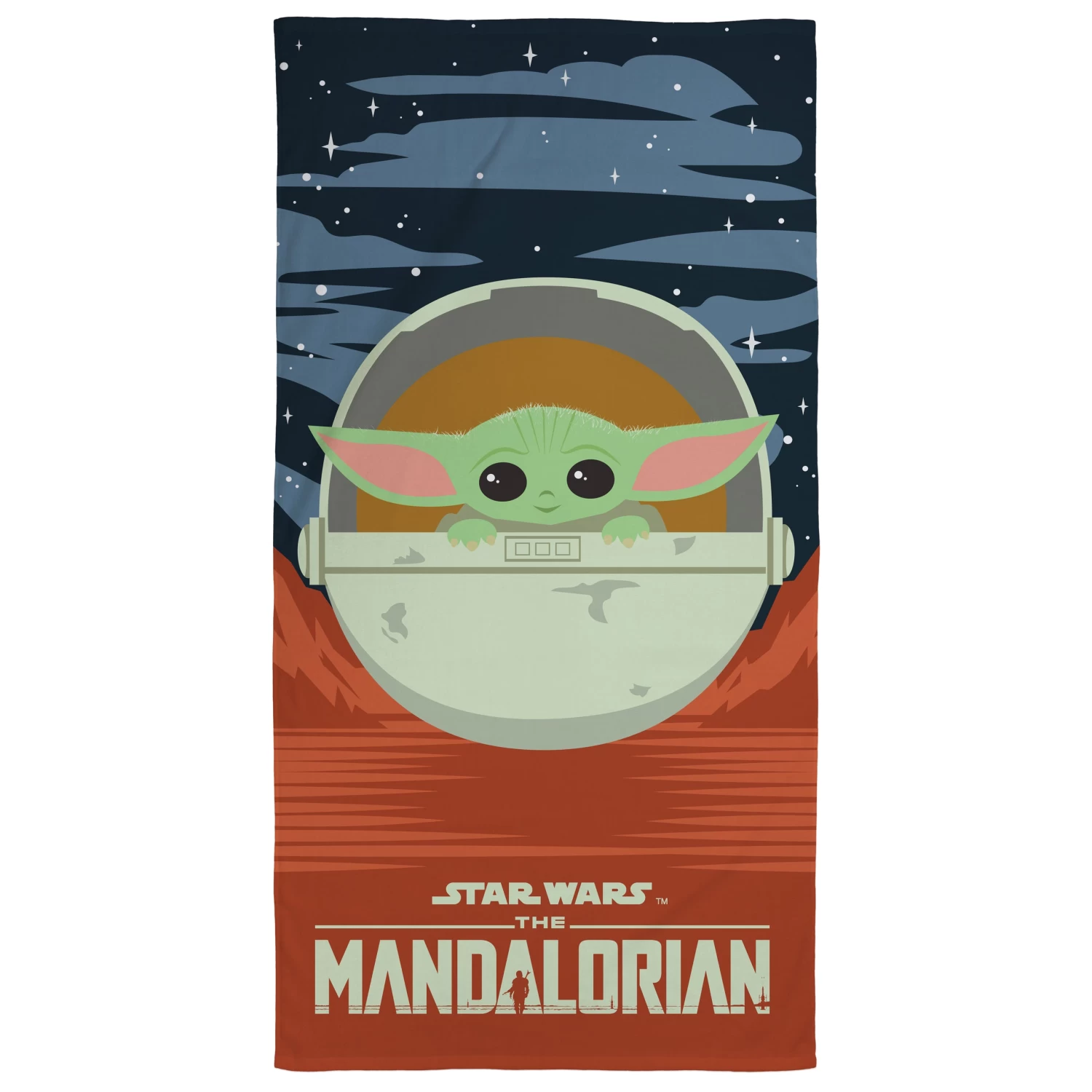 Get your little bounty hunter ready for a day at the beach with this adorable Mandalorian towel. This cute kids towel showcases Grogu against a stary sky and a red planet. Also featuring the Star Wars and The Mandalorian logo in contrasting grey. This fun Mandalorian towel is perfect for the beach, the pool or just the bath!