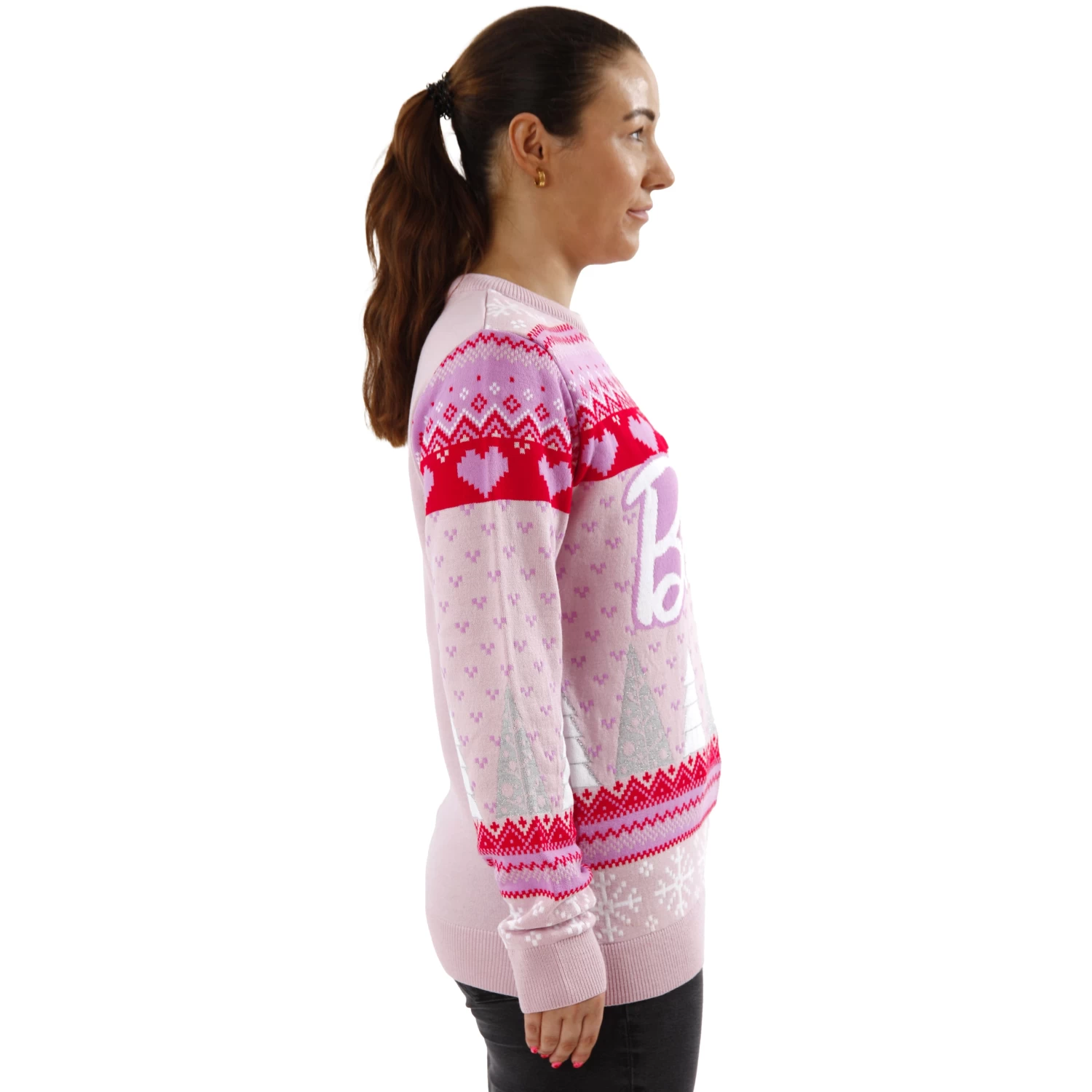 - Festive Barbie Christmas jumper featuring a vibrant pink, red, and white pattern with a sparkly glitter tree design.