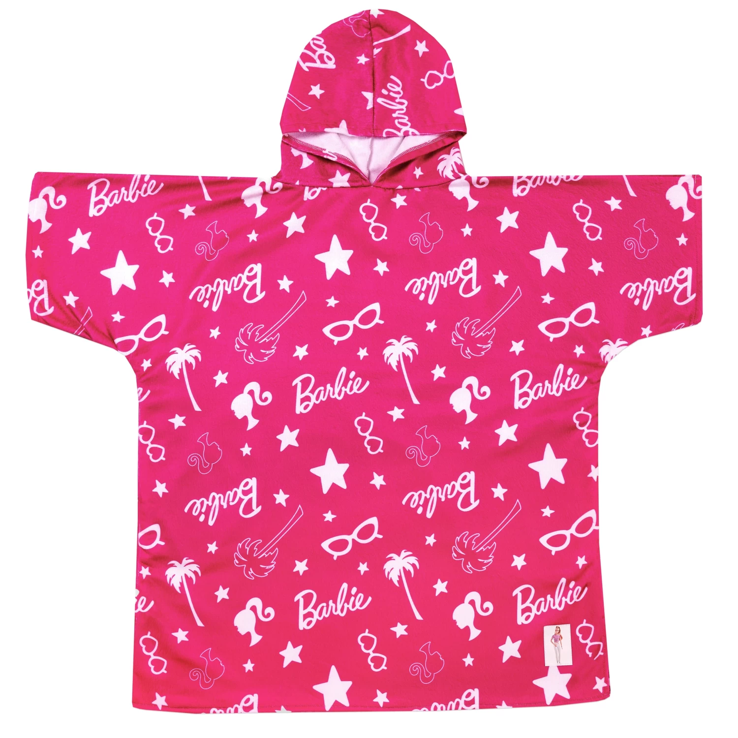 Barbie fans get ready to make a splash in this fun hooded Barbie towel poncho. Featuring an all over pattern of the Barbie logo, Stars, Sunglasses and Palm trees as well as a Barbie patch in the bottom left corner. With a hood for extra comfort this is the perfect beachwear for any Barbie fan!