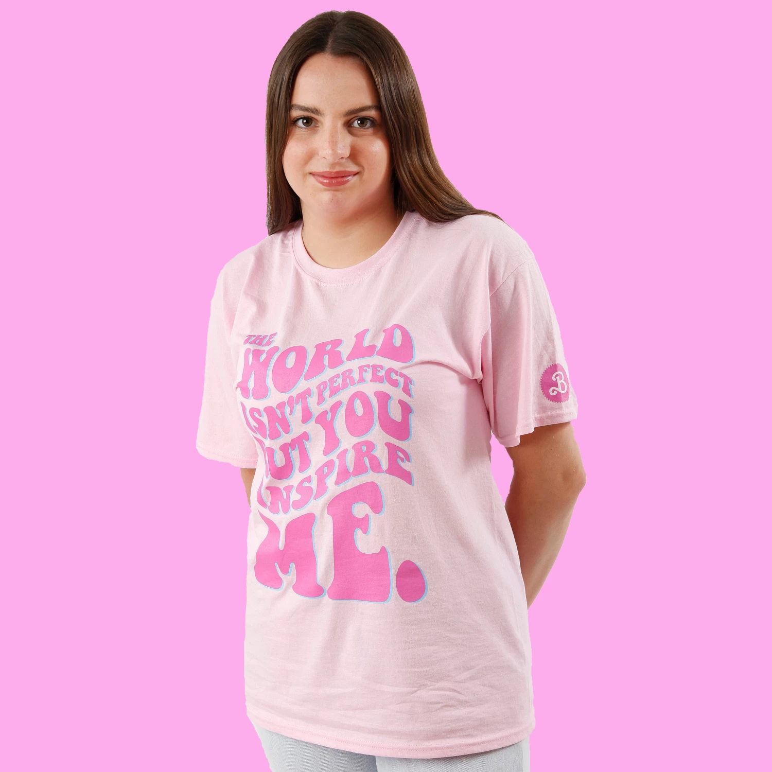 Discover our Barbie T-Shirt for Women and embrace your inner fun-loving spirit. This vibrant pink tee features a playful message in a retro font, reminding you that “The World Isn’t Perfect But You Inspire Me.” With the iconic Barbie logo on the sleeve, this shirt is perfect for adults who want to add a touch of whimsy to their wardrobe. Made from 100% cotton, it offers both comfort and style for a playful and confident look.