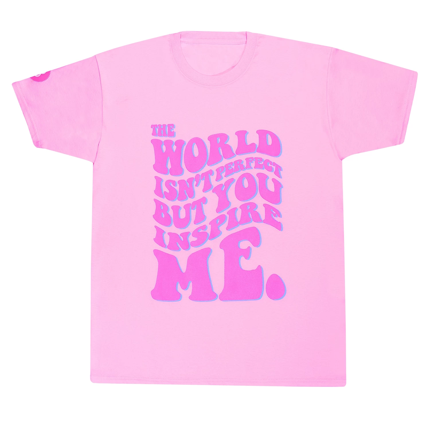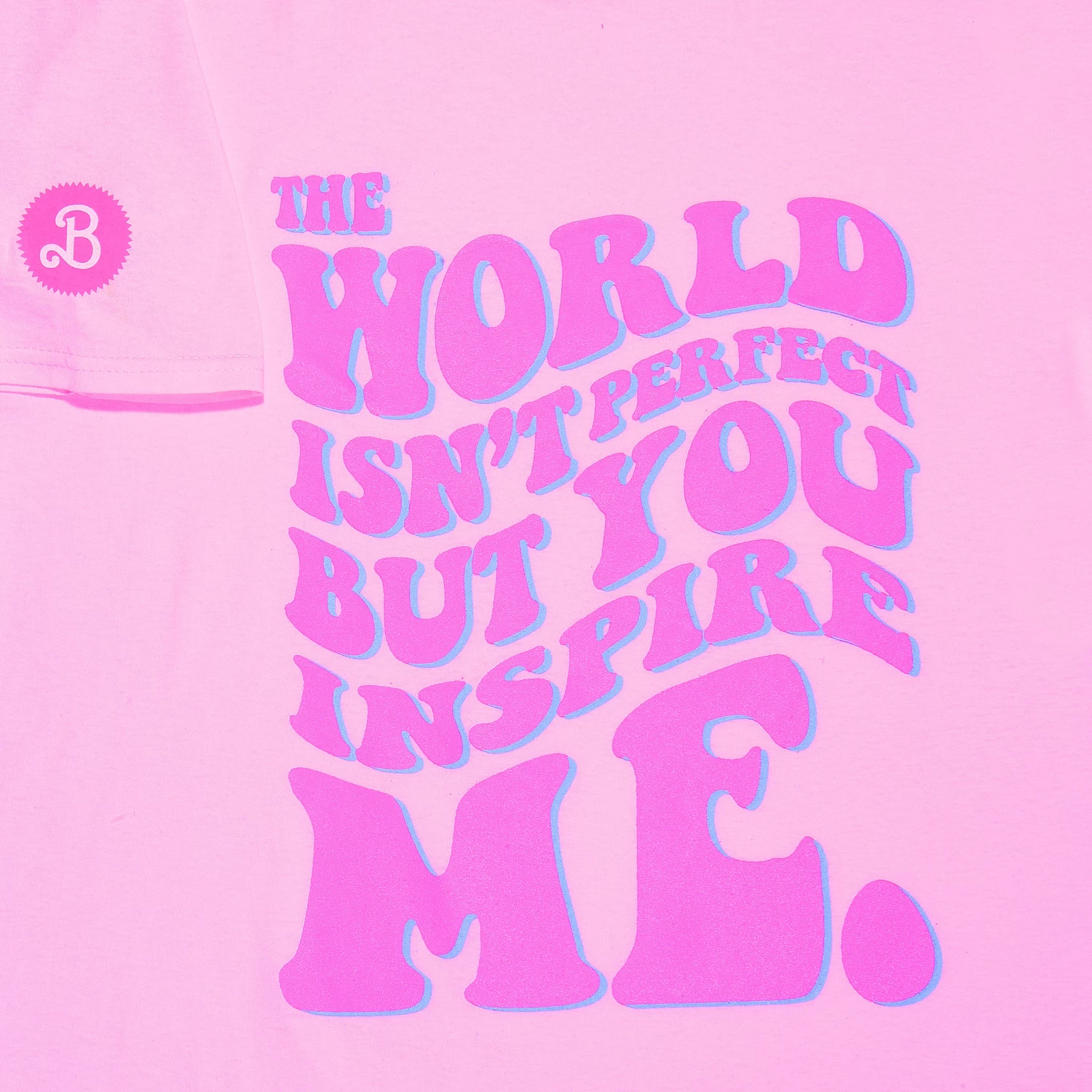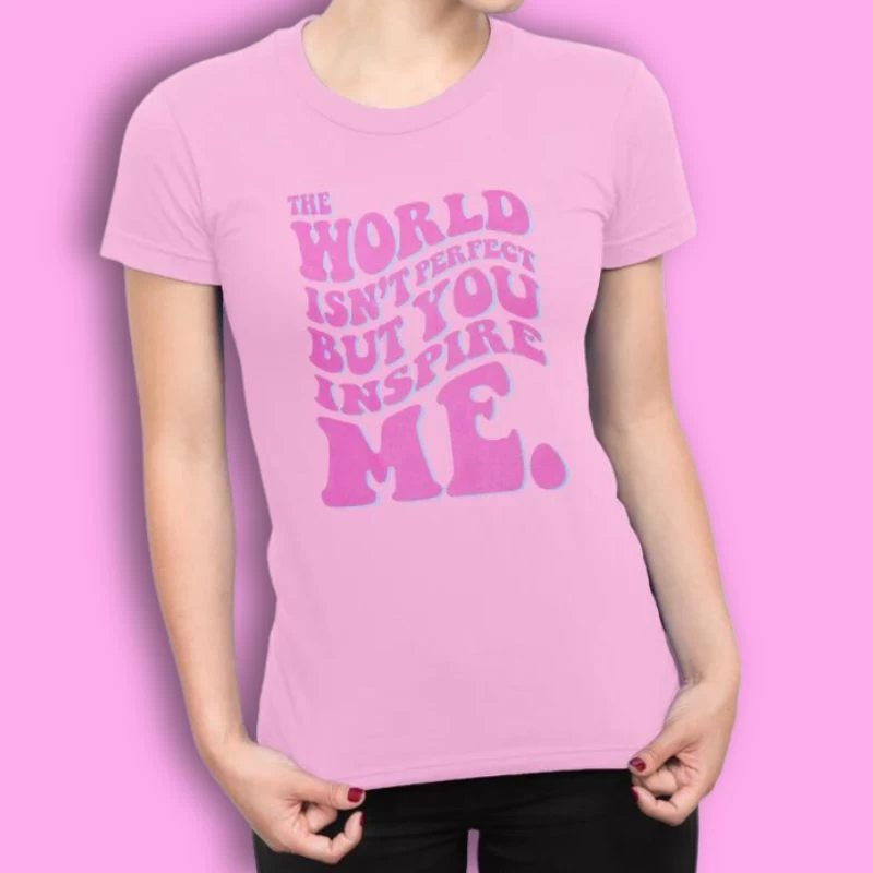 - Inspire yourself with our Barbie T-Shirt for Women, a playful pink tee featuring the uplifting message “The World Isn’t Perfect But You Inspire Me” in a retro font.