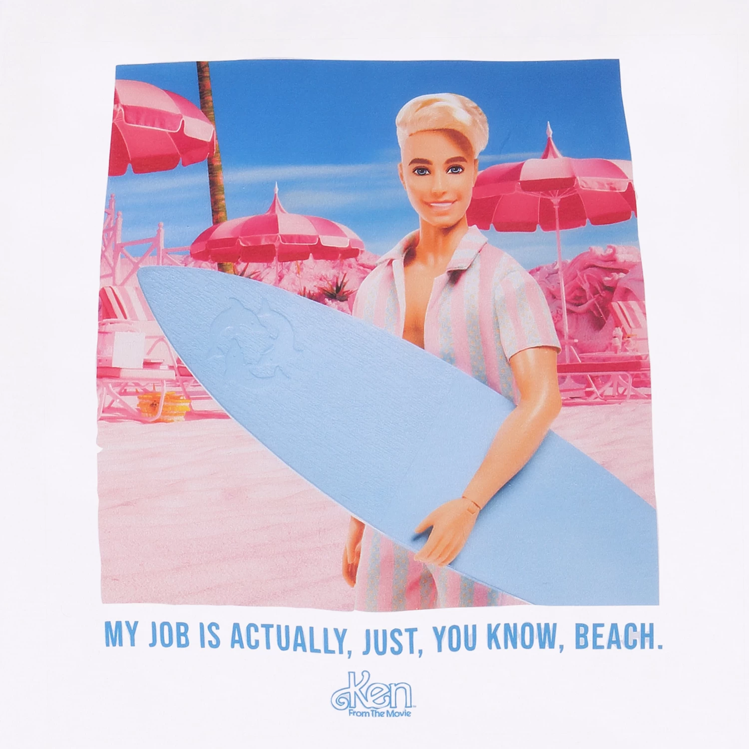 - Playful Ken T-Shirt for women: white tee with a graphic print of Ken carrying a surfboard on the beach, featuring the classic Ken logo in blue with the fun phrase ‘My Job is Actually, Just, You Know, Beach’ underneath.