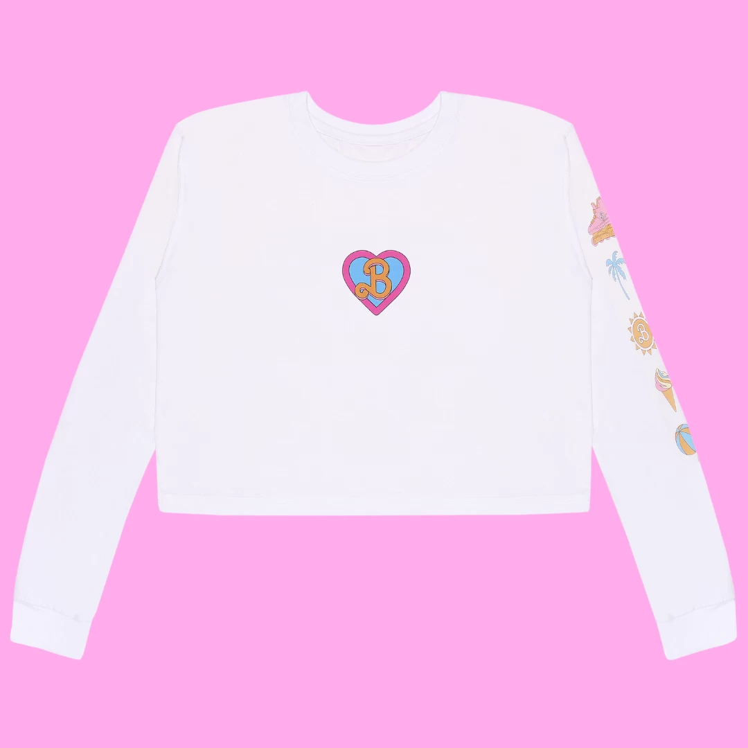 - Show off your playful side with this vibrant Barbie crop top for Women. The white long sleeve design is adorned with a fun and colorful print featuring roller blades, palm trees, the sun, ice cream, and a beach ball.