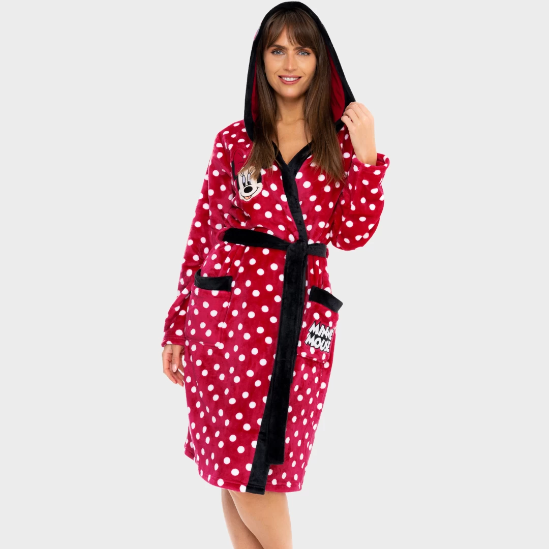 Bring back Disney to your cosy winter evening with this sumptuously soft Ladies Minnie Mouse robe. Featuring the classic Minnie polka dot and a tie belt fastening this is the perfect ladies dressing gown for cosy evenings. The luxurious soft fleece feel and cute Minnie design will cheer you up on even the gloomiest of winter evenings. For ultimate comfort this ladies Minnie bathrobe also has a hood.