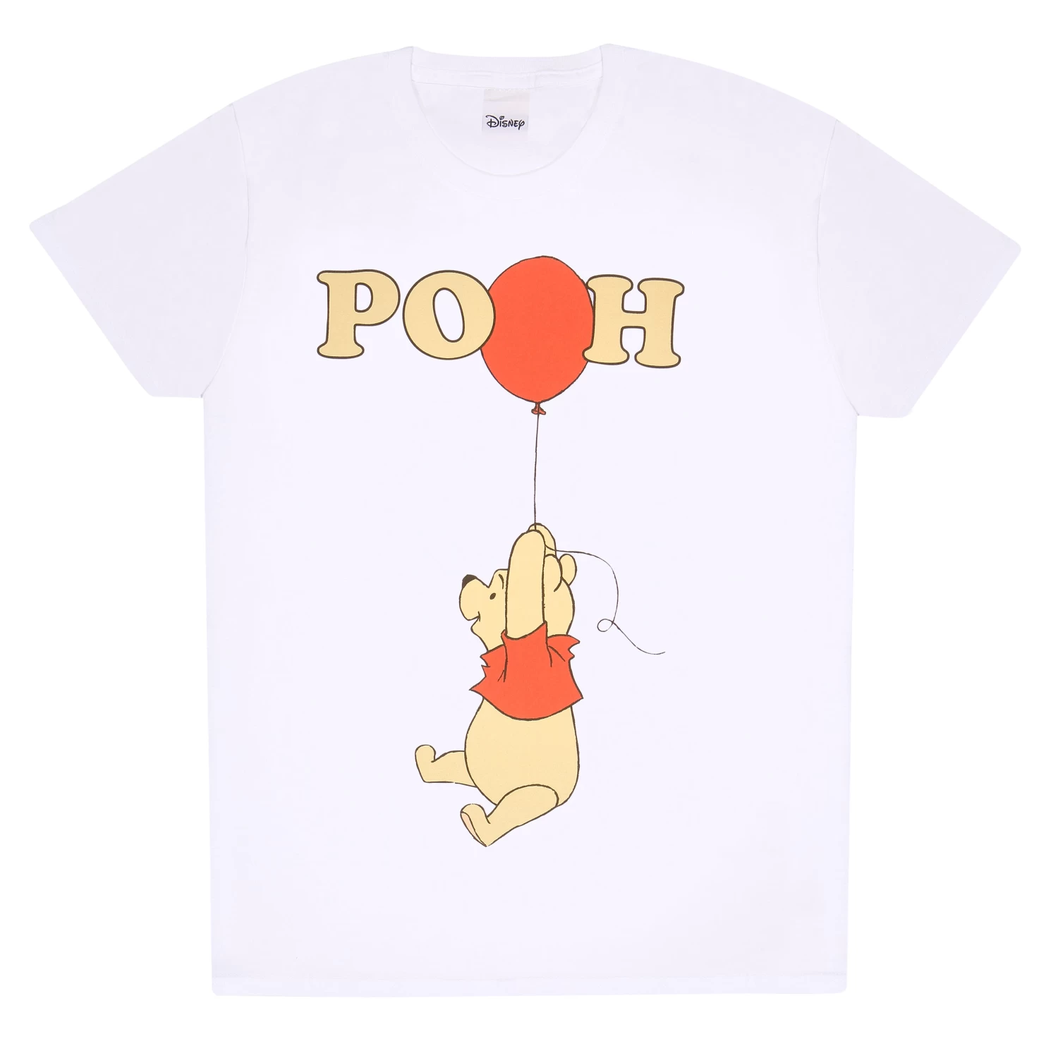 - Embark on a whimsical journey with this eye-catching tee featuring Winnie The Pooh holding a cheerful red balloon while floating through the sky. The cleverly styled ‘Pooh’ text above him uses the red balloon as one of the ‘O’s, adding an extra touch of playfulness to this Disney t-shirt!