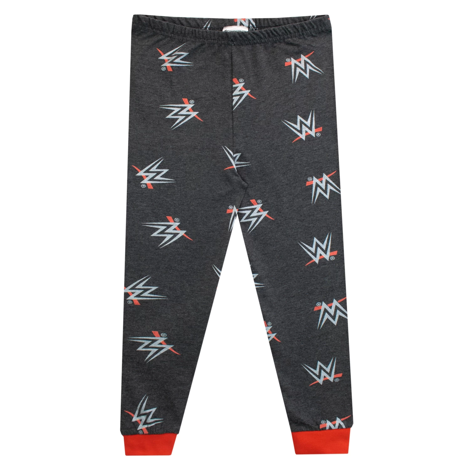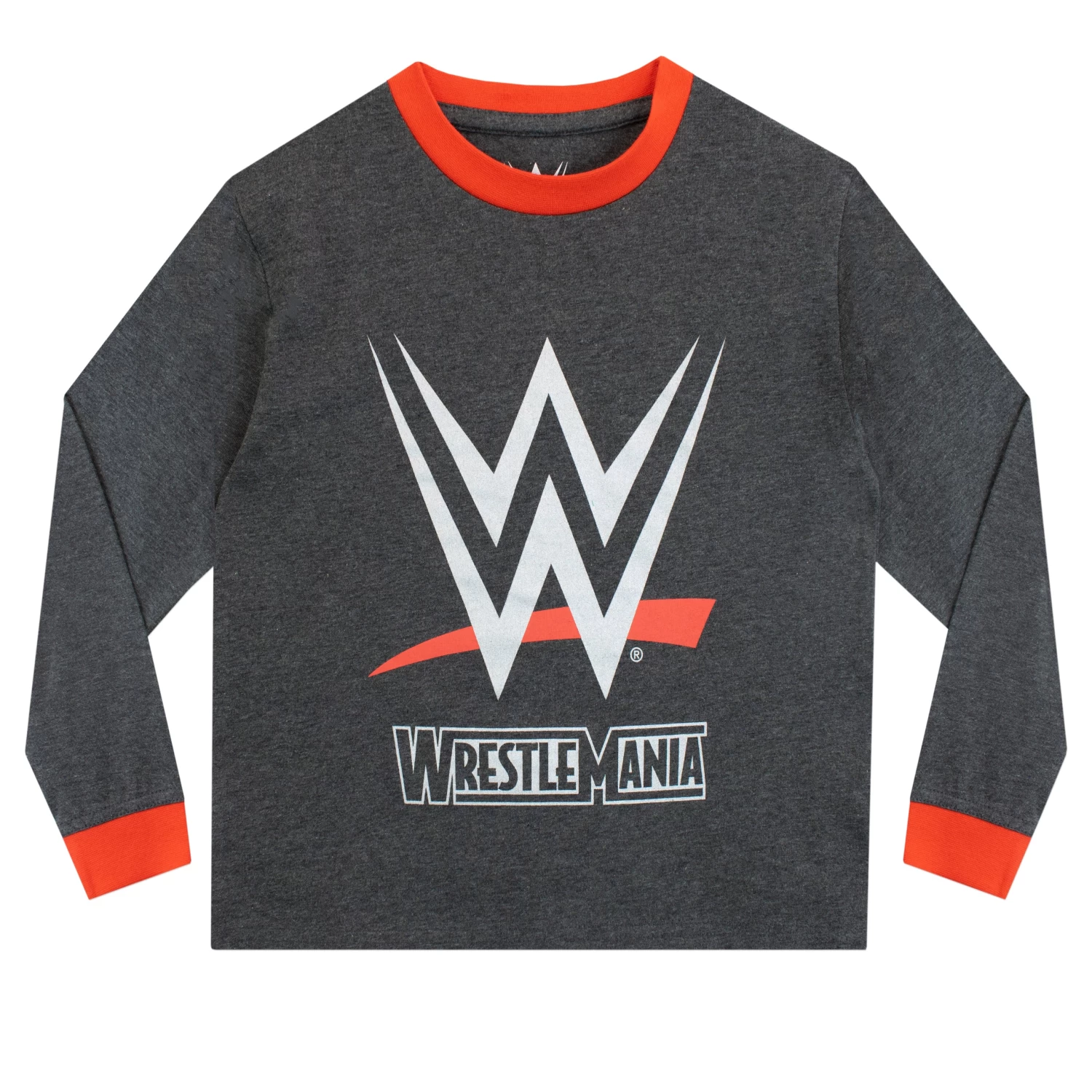 These wrestling pyjamas are made for super fans of WWE! Featuring a grey long sleeve top with the iconic WWE logo in the centre. The slogan ‘Wrestle Mania’ underneath with red contrasting hems on the neck and sleeves. Complete with an all over WWE print motif on the bottoms and red cuffs for comfort. The perfect WWE pj set for your mini wrestler to wear in the ring!